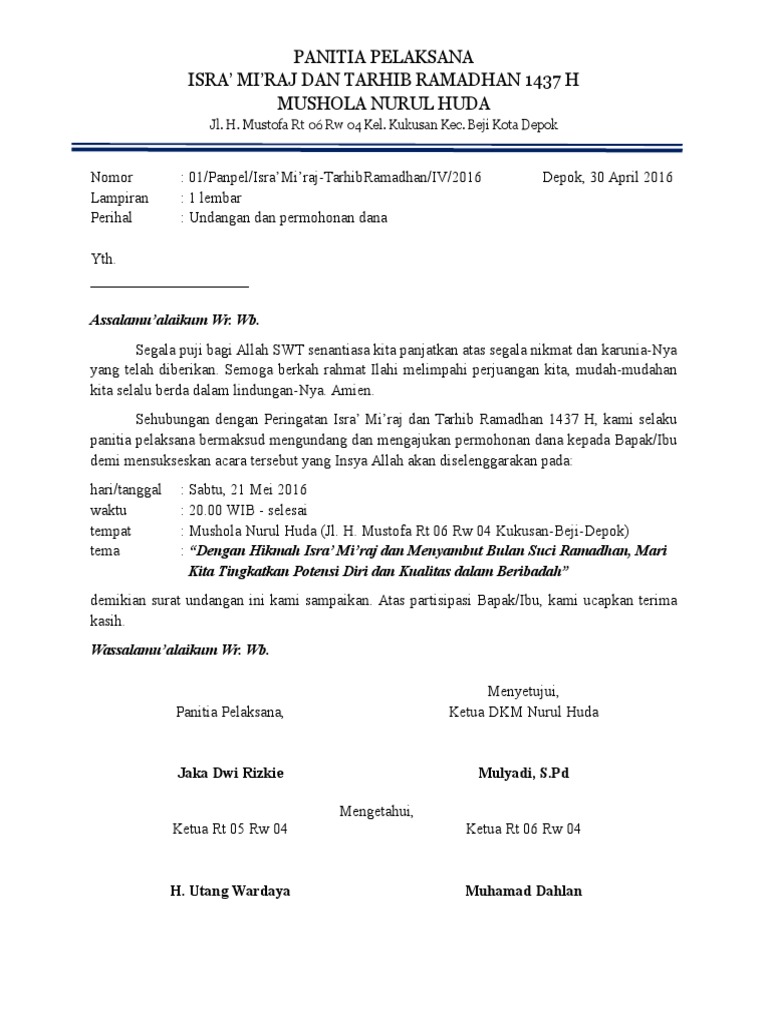 Surat permohonan dana isra miraj. Contoh proposal rajaban tukang ngetik. Contoh surat undangan gotong royong pdf. Untuk kesusesan acara biasanya panitia memberikan undangan undangan pada jemaah dan siswa/siswi di sekolah. Text of surat undangan isra mi'raj.